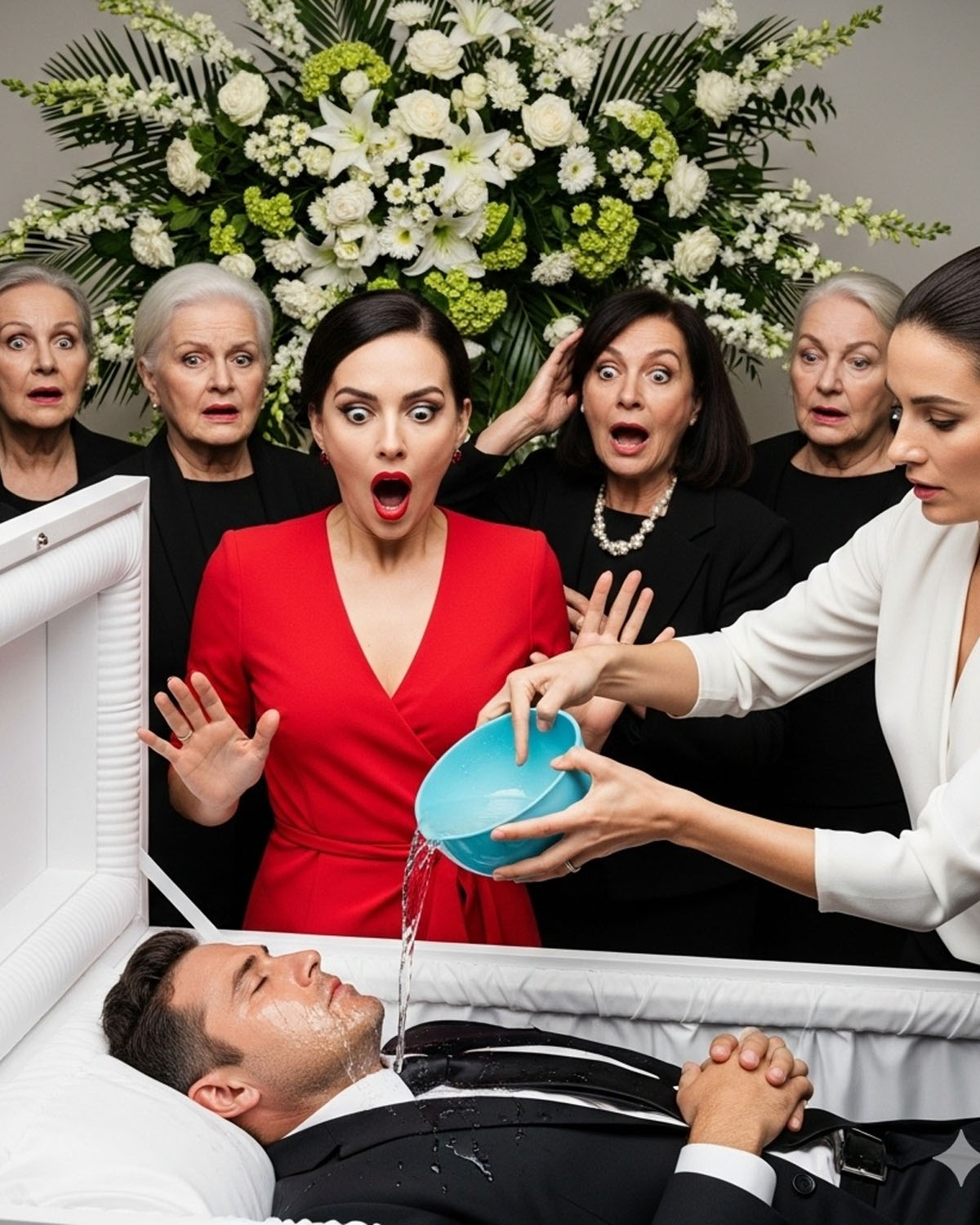 La iglesia estaba en silencio hasta que ella entró: vestida de negro, mirada serena, llevando un balde plateado con agua helada. Nadie entendía. No hasta que llegó al ataúd abierto… y vació el agua directamente sobre la cara de su esposo.