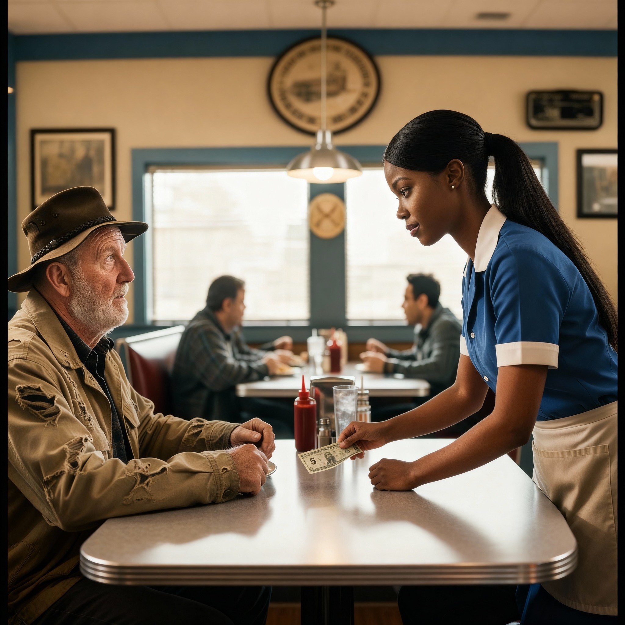 Naomi Brooks, una mesera afroamericana agotada por otro brutal doble turno, bajó la mirada hacia el hombre sentado solo en la mesa seis.