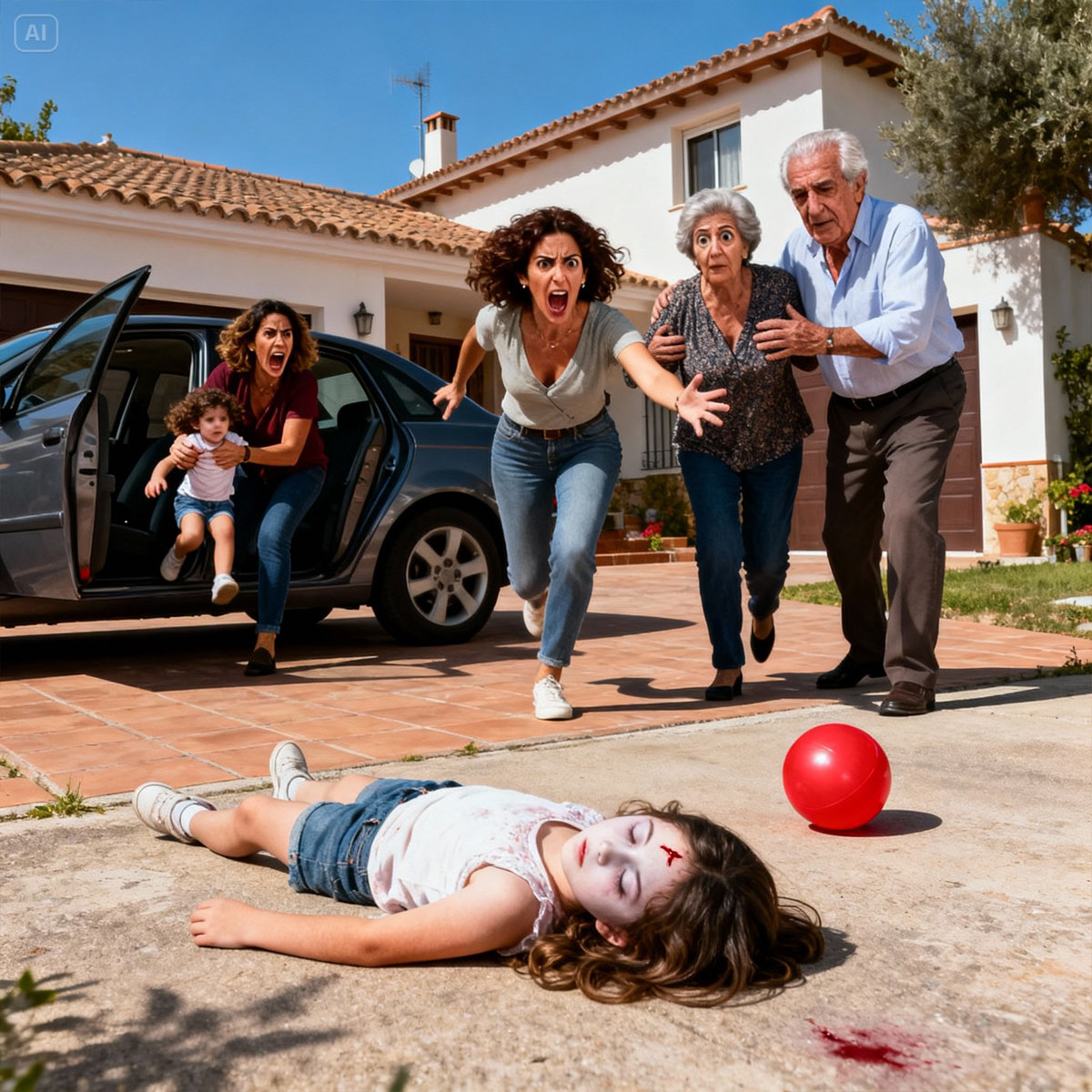 En casa de mis padres, aquel domingo parecía tranquilo hasta que todo se rompió. Mi hija de seis años, Lucía, jugaba en el patio delantero con una pelota roja, riéndose mientras yo conversaba en la cocina con mi madre, Carmen. De pronto escuché un golpe seco, metálico, imposible de confundir. El sonido me atravesó el pecho y salí corriendo sin pensar. Al llegar al portón vi la escena que aún me persigue en sueños: el coche de mi hermana Ana estaba detenido en diagonal y Lucía yacía en el suelo, inmóvil.