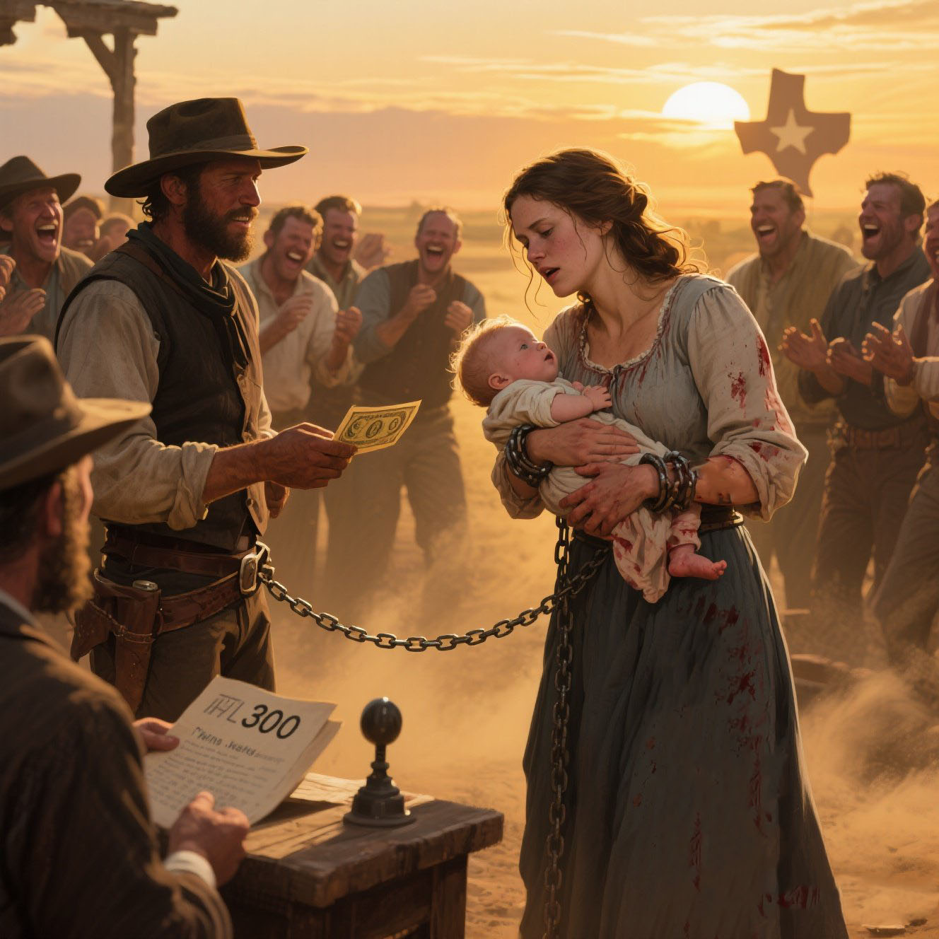 Estaba sangrando aún del parto cuando la subastaron, pero un ranchero la compró solo para darle una cama y dejarla dormir. Territorio de Texas. Finales del verano de 1879. El sol caía sobre el pueblo de Cekorrech como el ojo de algo cruel. El polvo se levantaba bajo las botas de los vaqueros, vagabundos y carroñeros, todos apiñados en la plaza, donde un escenario de madera improvisado se alzaba como un altar a todo lo roto.