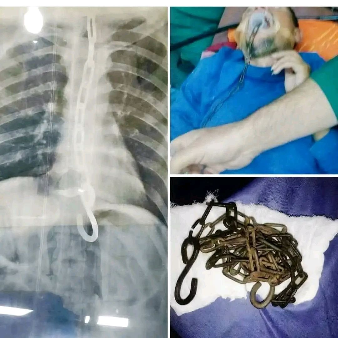 Pero lo más perturbador surgió en el hospital regional. Uno de los sobrevivientes ingresó con un cuadro clínico que dejó helados a los doctores. Las radiografías (foto de los rayos X y las cadenas) mostraban una cadena metálica gruesa alojada en su esófago y estómago. Al parecer, en el momento del impacto, la fuerza fue tal que objetos metálicos salieron volando como proyectiles, o quizás, en un acto de desesperación o locura traumática, el hombre tragó lo que tenía a la mano. La imagen de la cadena siendo extraída de su garganta es digna de una película de terror, una prueba más de que la realidad supera la ficción.