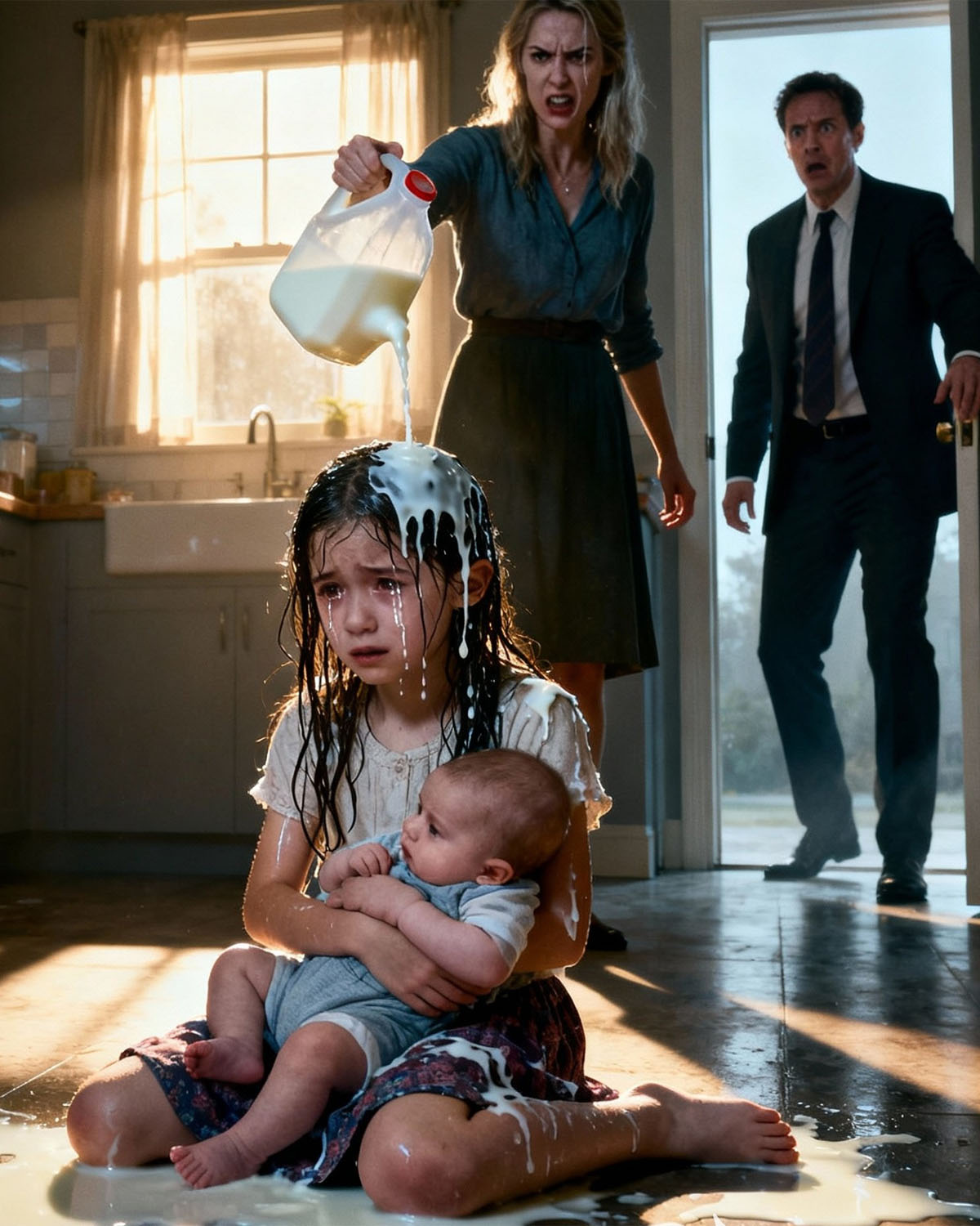 Emily estaba agachada en el suelo de baldosas, con leche goteando por su cabello, su vestido empapado, charcos extendiéndose alrededor de sus rodillas. Sostenía a Alex firmemente contra su pecho, su pequeño rostro enterrado en el hombro de ella. De pie sobre ellos, con una expresión destrozada convertida en ira, estaba Vanessa, sosteniendo la jarra de leche vacía como un arma.