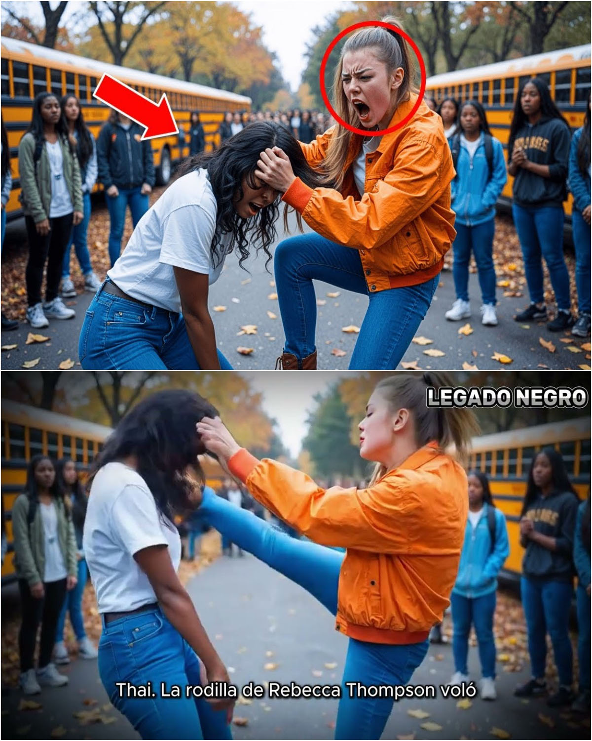 La valiente intentó dar un arrodillazo en la cara a la nueva chica negra. Gran error. Ella era campeona mundial de Muai Thai. La rodilla de Rebeca Thompson voló hacia la cara de Kea con toda la fuerza que una chica de 17 años puede reunir cuando quiere humillar a alguien públicamente.