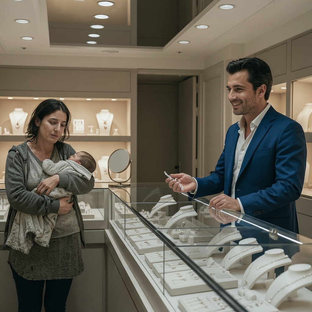 Entrar en la joyería Ruiz e hijos fue como cruzar una frontera entre dos planetas. La campana sobre la puerta apenas sonó y, al instante, las miradas se clavaron en ella: señoras con bolsos caros, hombres con corbatas perfectamente anudadas, empleados cuya expresión variaba entre indiferencia y curiosidad calculada. Sofía sintió el calor del juicio y la vergüenza enrojeciendo sus mejillas, pero la desesperación empujó sus pasos. Con voz temblorosa pidió hablar con el propietario. “Quiero vender este anillo”, dijo, y el anillo, una pequeña esmeralda rodeada por un engaste sencillo, brilló débilmente en sus manos. “Necesito dinero para la leche de mi hijo”.