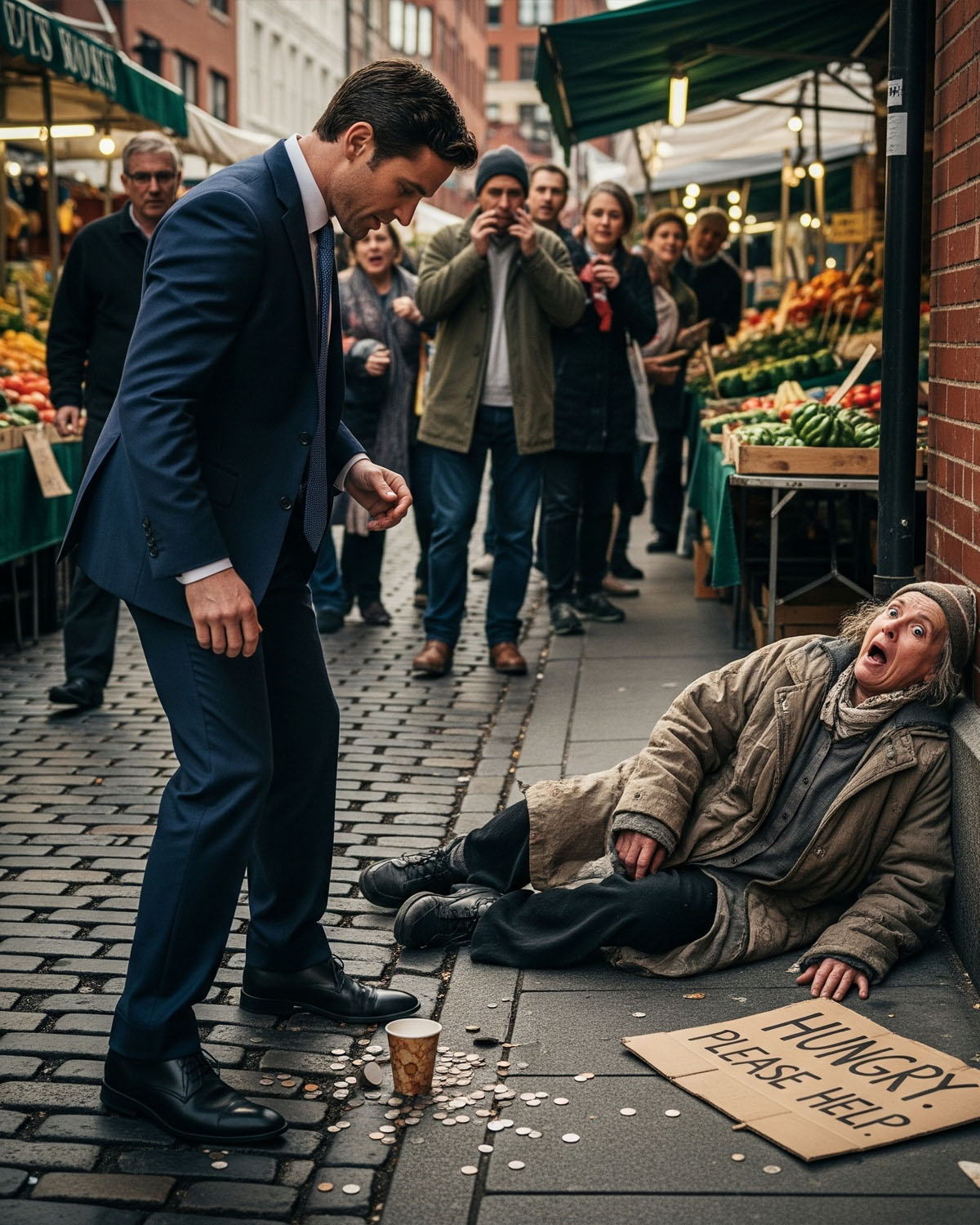 Cuando la mano temblorosa de la mujer rozó accidentalmente su pierna, Adrian retrocedió. Sin pensar, la apartó de un empujón con el pie. Las monedas se desparramaron por el pavimento mientras ella caía de espaldas contra la pared. La gente cercana ahogó un grito.
