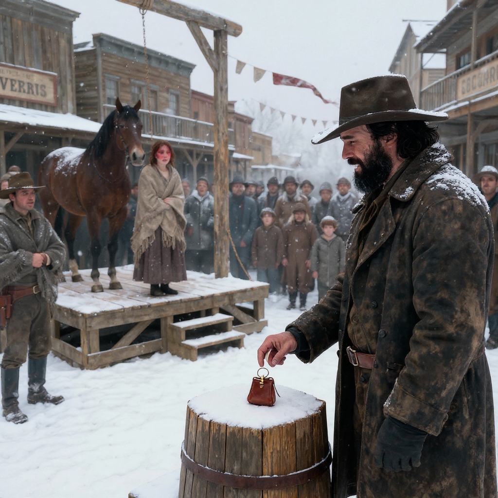 El viento de invierno cortaba las caras en Elk Fork, trayendo consigo el olor agrio del whisky y un rumor de desprecio que parecía aferrarse a cada esquina. Aquella mañana la plaza junto al establo se había llenado como si esperaran un espectáculo: hombres con botas embarradas, mujeres con chales apretados y niños curiosos que intentaban esconder la vergüenza propia detrás de risas nerviosas. En el centro, sobre un bloque de madera, Conrad Bans exhibía todo lo que quedaba de su orgullo y sus deudas: una yegua robusta y su propia hija, Eleanor, envuelta en un chal demasiado fino para la temporada, con las mejillas enrojecidas por el frío y por la humillación.