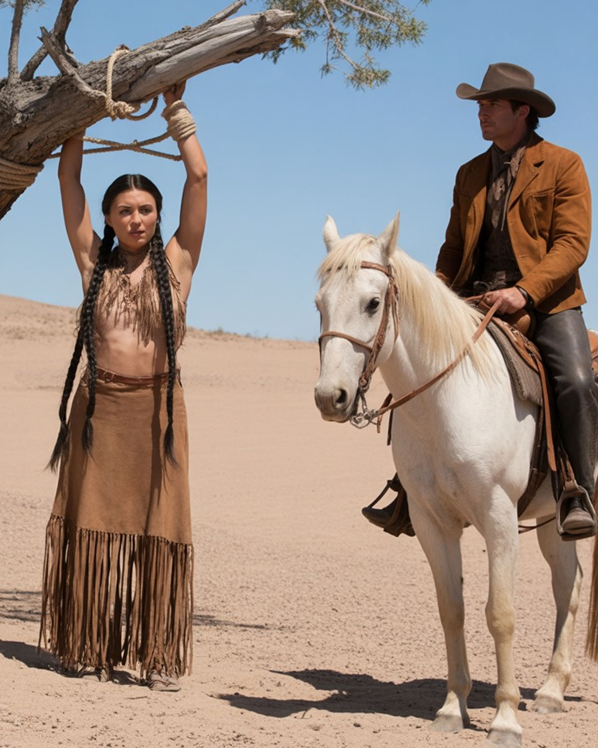 Un sonido agudo quebrado más allá de las dunas y los nopales retorcidos. Sin dudar, giró las riendas y cabalgó hacia la fuente de aquel murmullo fantasmal. Al llegar un claro rodeado de mezquites, su sangre celó. Ahí, bajo la única sombra, colgaba una figura pequeña suspendida de las muñecas atadas