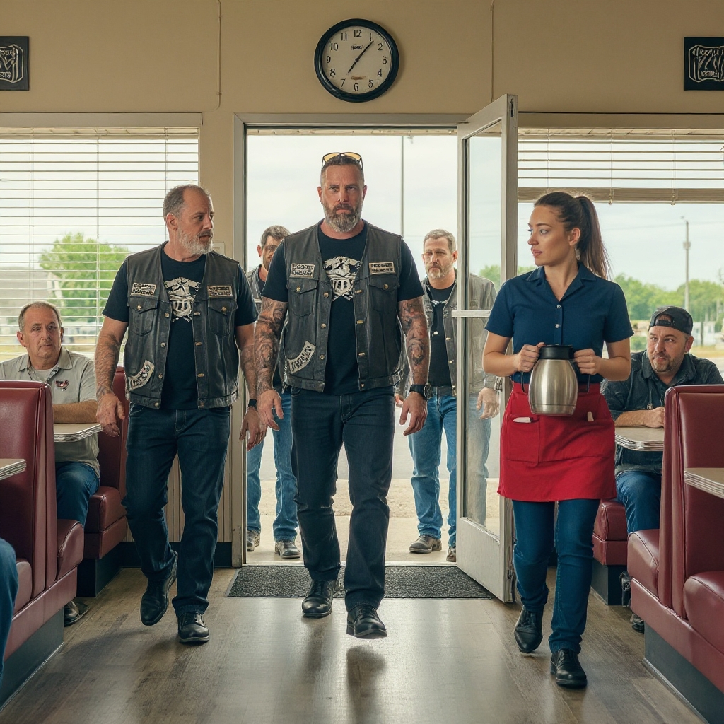 Entraron con un paso que llenó el lugar de presencia: chalecos de cuero, insignias bordadas, tatuajes que trazaban historias en los brazos, botas que resonaban como un latido firme en el suelo de madera. Un grupo de hombres que parecían traer con ellos la gravedad de largos caminos recorridos. En medio de ellos, más alto que los demás, entró un hombre cuya barba, ya salpicada de canas, le daba una autoridad serena. Sus ojos recorrieron la sala hasta fijarse en Walter y, en ese instante, algo cambió en la expresión del anciano.